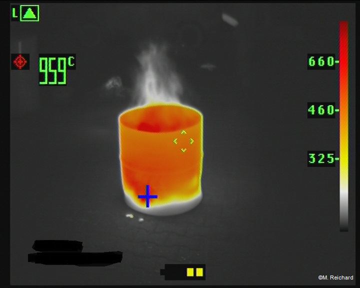 In der Nähe einer mit Gas betriebenen Flamme (z.B. in einer Küche) richten die Teilnehmer die Wärmebildkamera zuerst aus der Entfernung auf die Flamme, dann gehen sie direkt auf die Flamme zu, sodass diese das Kamerabild fast vollständig ausfüllt.